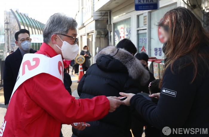 [서울=뉴스핌] 김민지 기자 = 서울 종로 보궐선거에 출마한 최재형 국민의힘 후보가 3일 오전 서울 종로구 세검정초등학교 인근에서 시민들에게 인사를 하고 있다. 2022.03.03 kimkim@newspim.com