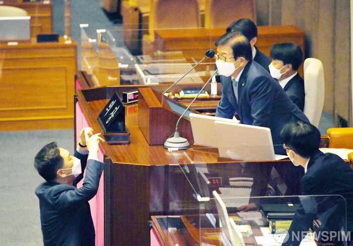 [서울=뉴스핌] 최상수 기자 = 5일 국회 본회의에서 김기현 국민의힘 원내대표가 박병석 의장에게 다가와 대화하고 있다. 2022.04.05 kilroy023@newspim.com