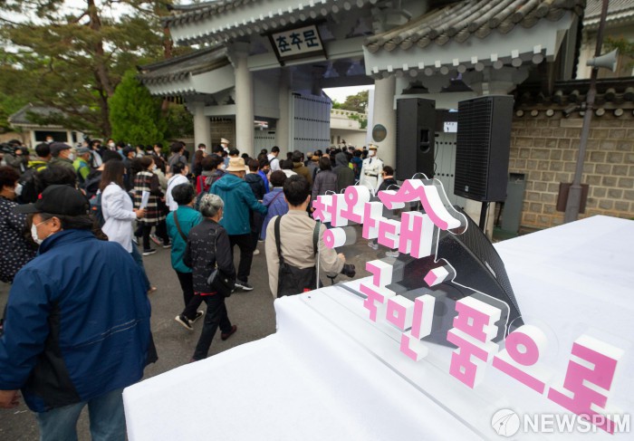 [서울=뉴스핌] 윤창빈 기자 = 10일 오전 서울 종로구 청와대 춘추문이 열리자 시민들이 입장하고 있다. 2022.05.10 pangbin@newspim.com