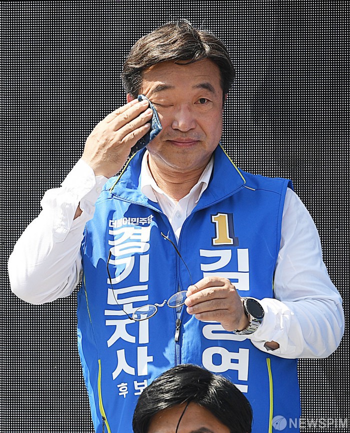 [용인=뉴스핌] 이형석 기자 = 윤호중 더불어민주당 상임선거대책위원장이 29일 경기도 용인시 용인중앙시장 앞에서 백군기 용인시장 후보의 지원유세 중 땀을 닦고 있다. 2022.05.29 leehs@newspim.com