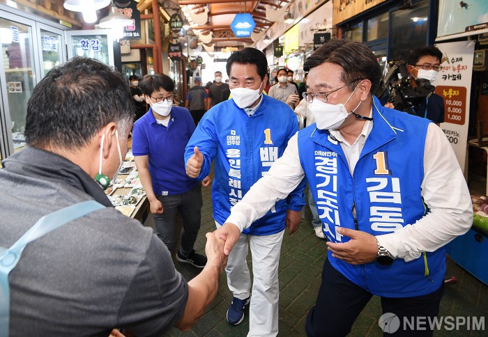 [용인=뉴스핌] 이형석 기자 = 윤호중 더불어민주당 상임선거대책위원장과 백군기 용인시장 후보가 29일 경기도 용인시 용인중앙시장을 방문해 상인과 인사를 하고 있다. 2022.05.29 leehs@newspim.com