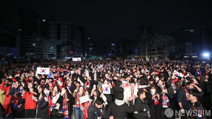 [서울=뉴스핌] 황준선 기자 = 2022 카타르 월드컵 H조 대한민국과 포르투갈의 경기가 열린 3일 오전 서울 종로구 광화문 광장에서 거리응원을 나온 시민들이 우르과이와 가나의 경기가 끝난 뒤 대한민국의 16강 진출 확정에 기뻐하고 있다. 2022.12.03 hwang@newspim.com