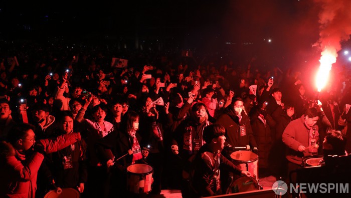 [서울=뉴스핌] 황준선 기자 = 2022 카타르 월드컵 H조 대한민국과 포르투갈의 경기가 열린 3일 오전 서울 종로구 광화문 광장에서 거리응원을 나온 시민들이 대한민국의 득점에 기뻐하고 있다. 2022.12.03 hwang@newspim.com