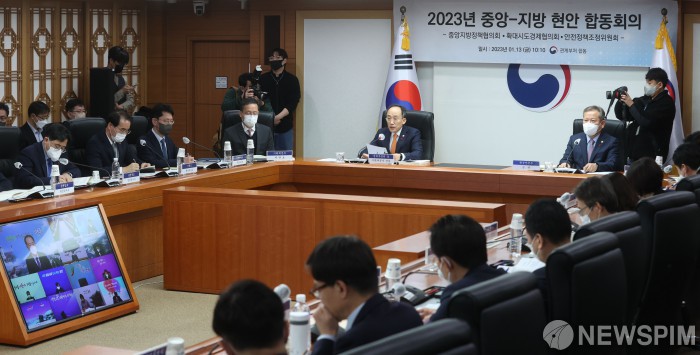 [서울=뉴스핌] 김학선 기자 = 추경호 경제부총리 겸 기획재정부 장관이 13일 서울 종로구 정부서울청사에서 열린 2023년 중앙-지방 현안 합동회의에서 모두발언을 하고 있다. 오른쪽은 이상민 행정안전부 장관. 2023.01.13 yooksa@newspim.com