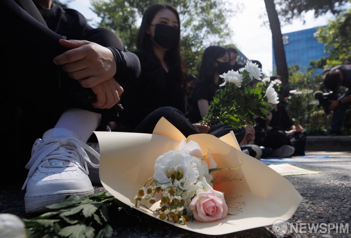 [서울=뉴스핌] 윤창빈 기자 = 2일 오후 서울 여의도 국회의사당 역 인근에서 열린 50만 교원 총궐기 추모 집회에 참석한 선생님들이 국화꽃을 들고 있다. 2023.09.02 pangbin@newspim.com