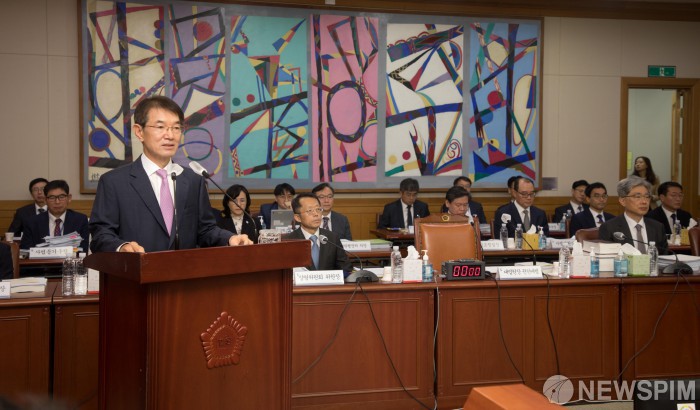 [서울=뉴스핌] 국회사진기자단 = 10일 오전 대법원에서 열린 국회 법제사법위원회의 대법원 국정감사에 안철상 대법원장 권한대행이 참석해 발언을 하고 있다. 2023.10.10 photo@newspim.com