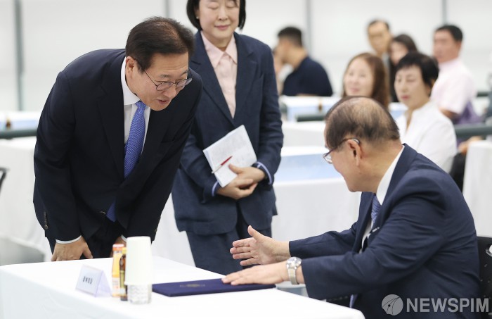 [서울=뉴스핌] 정일구 기자 = 박성재 법무부 장관과 이종찬 광복회장이 12일 오후 서울 서대문구 국립대한민국임시정부기념관에서 열린 제79주년 광복절 기념 독립유공자 후손 대한민국 국적증서 수여식에서 인사를 나누고 있다. 2024.08.12 mironj19@newspim.com
