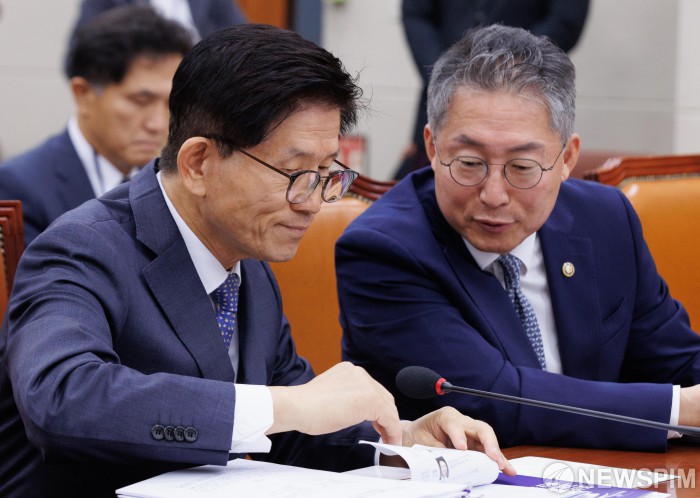 [서울=뉴스핌] 윤창빈 기자 = 김문수 고용노동부 장관, 김민석 고용노동부 차관이 10일 오전 서울 여의도 국회에서 열린 환경노동위원회의 고용노동부에 대한 국정감사에서 자료를 살펴보고 있다. 2024.10.10 pangbin@newspim.com