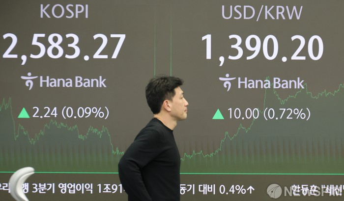 [서울=뉴스핌] 양윤모 기자 = 외국인 투자자의 매도 우위 속, 25일 오후 3시 30분 코스피 지수는 전일 종가보다 2.24포인트(0.09%) 상승한 2,583.27로, 코스닥 지수는 7.18포인트(-0.98%) 하락한 727.41로 한 주의 거래를 마감했다. 서울 외환시장에서 달러/원 환율은 전일보다 8.70원(0.63%) 상승한 1,388.90원에 오후 거래를 마감한 가운데, 서울 중구 하나은행 딜링룸에서 직원들이 업무를 보고 있다. 2024.10.25 yym58@newspim.com