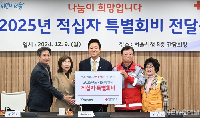 [서울=뉴스핌] 양윤모 기자= 오세훈 서울시장이 9일 서울시청에서 2025년 적십자 특별회비를 전달한 뒤 권영규 대한적십자사 서울지사 회장 등 참석자들과 기념촬영을 하고 있다. 2024.12.09 yym58@newspim.com