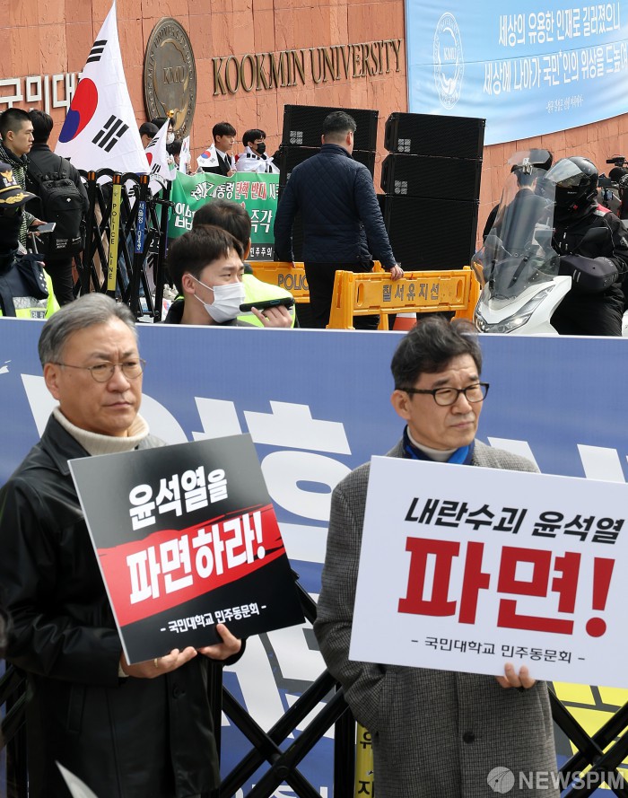 [서울=뉴스핌] 정일구 기자 = 12일 오후 서울 성북구 국민대학교 정문 앞에서 국민대학교 시국대회 및 민주동문회(아래쪽) 관계자들이 윤석열 대통령 파면 촉구 집회를 자유민주주의를 수호하는 국민인들(위쪽) 관계자들이 탄핵 반대 집회를 하고 있다. 2025.03.12 mironj19@newspim.com