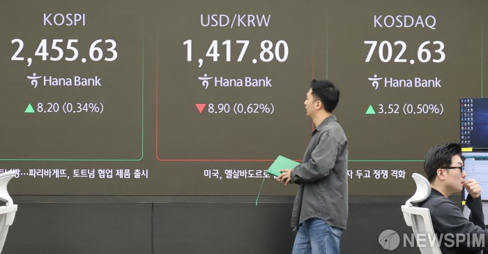 [서울=뉴스핌] 양윤모 기자 = 뉴욕증시의 3대 주가지수가 급락한 가운데 17일 오전 코스피 지수가 전 거래일 종가보다 8.20포인트(0.34%) 오른 2,455.63으로, 코스닥 지수는 3.2포인트(0.50%) 오른 702.63로 거래를 시작했다. 서울 외환시장에서 원/달러 환율은 전 거래일보다 8.90원 내린 1,417.80원에 거래되는 가운데, 서울 중구 하나은행 딜링룸에서 직원들이 업무를 보고 있다. 2025.04.17 yym58@newspim.com
