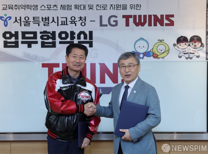 [서울=뉴스핌] 양윤모 기자 = 정근식 서울시교육감과 김인석 LG트윈스 대표이사가 23일 오후 서울 송파구 잠실야구장에서 교육취약학생을 위한 스포츠 체험 및 진로 탐색 지원을 위한 업무협약(MOU)을 체결후 악수를 하고 있다. 이번 협약을 통해 양측은 총 6회에 걸쳐 1,200명의 학생과 인솔자에게 홈경기 관람 기회를 제공하고, 야구 교실 및 치어리딩스쿨 등 진로 체험 프로그램을 운영할 계획이다. [사진=서울시교육청] 2025.04.23 yym58@newspim.com