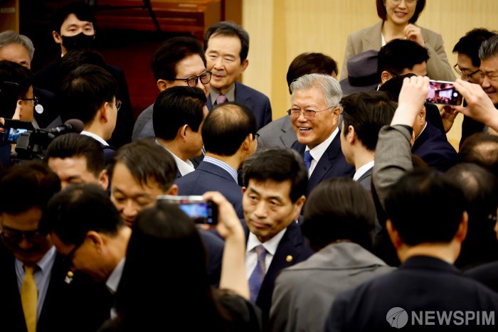 [서울=뉴스핌] 윤창빈 기자 = 문재인 전 대통령이 25일 국회도서관에서 열린 4.27판문점선언 7주년 기념식을 마치고 참석자들과 인사를 나누고 있다. 2025.04.25 pangbin@newspim.com