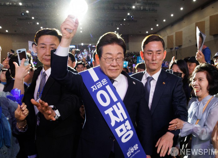 [광주=뉴스핌] 윤창빈 기자 = 이재명 더불어민주당 대선 경선 후보가 26일 광주 서구 김대중컨벤션센터에서 열린 제21대 대통령선거 후보자 선출을 위한 호남권 합동연설회에 입장하고 있다. 2025.04.26 pangbin@newspim.com