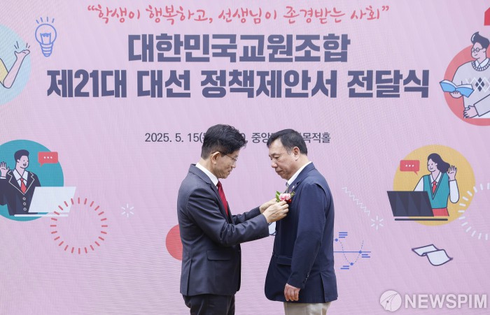 [서울=뉴스핌] 최지환 기자 =김문수 국민의힘 대선후보가 15일 서울 여의도 국민의힘 중앙당사에서 열린 대한민국교원조합 제21대 대선 정책제안서 전달식에서 박용우 대한민국교원조합 단장에게 카네이션을 전달하고 있다. 2025.05.15 choipix16@newspim.com