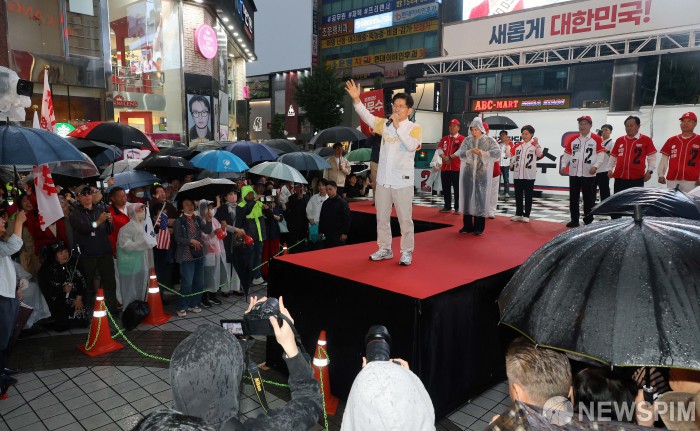 [대전=뉴스핌] 최지환 기자 = 김문수 국민의힘 대선 후보가 16일 오후 대전 중구 중앙로역 앞에서 열린 유세에서 시민들에게 지지를 호소하고 있다. 2025.05.16 choipix16@newspim.com