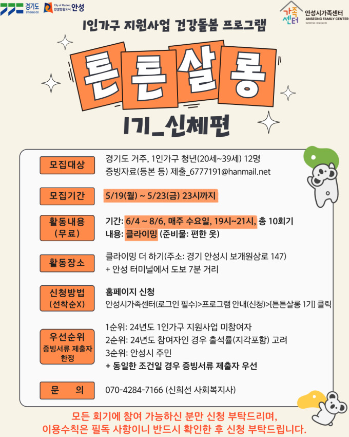 [안성=뉴스핌] 이석구 기자 = 경기 안성시 가족센터는 청년 1인가구의 건강 증진과 사회적 관계망 형성을 위한 '튼튼살롱 1기' 프로그램 참여자를 모집한다고 20일 밝혔다.