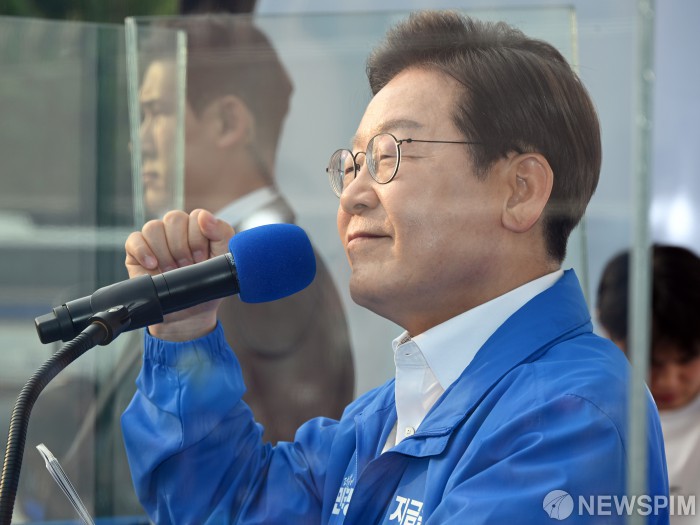 [서울=뉴스핌] 정일구 기자 = 이재명 더불어민주당 대선 후보가 대선 사전투표 첫날인 29일 서울 서초구 고속터미널 광장에서 유권자들에게 지지를 호소하고 있다. 2025.05.29 mironj19@newspim.com