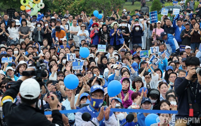 [서울=뉴스핌] 정일구 기자 = 제21대 대통령 선거를 하루 앞둔 2일 서울 강북구 북서울꿈의숲 서문광장에서 시민들이 이재명 더불어민주당 대선 후보의 유세현장를 지켜보고 있다. 2025.06.02 mironj19@newspim.com