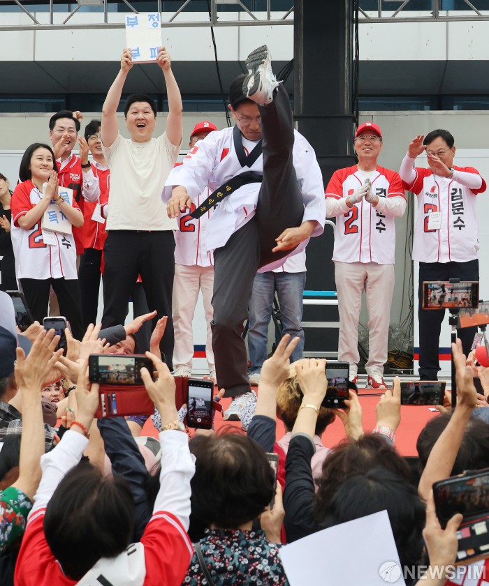[대전=뉴스핌] 윤창빈 기자 = 김문수 국민의힘 대선 후보가 2일 오후 대전 동구 대전역 서광장에서 열린 "울려라 함성, 들어라 승리의 메아리" 총괄거점유세에서 지지자로부터 태권도 도복을 선물 받은 뒤 발차기 실력을 선보이고 있다. 2025.06.02 pangbin@newspim.com