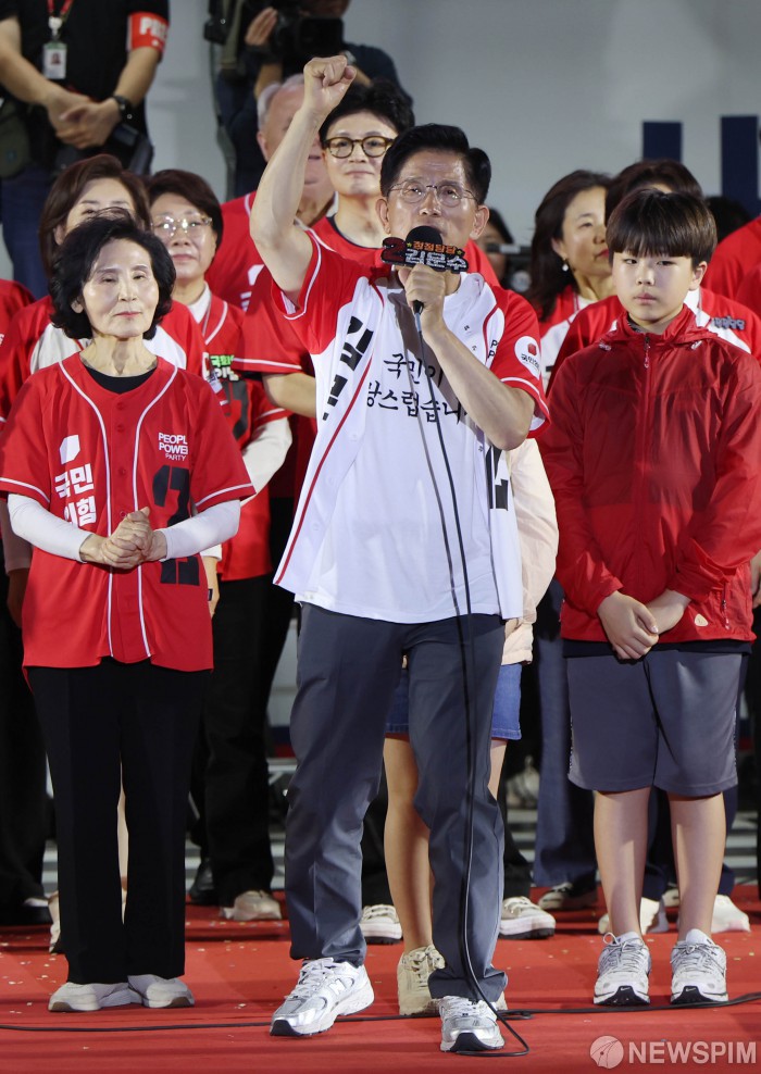 [서울=뉴스핌] 윤창빈 기자 = 김문수 국민의힘 대통령 후보가 2일 서울시청 광장에서 열린 "울려라 함성, 들어라 승리의 메아리" 피날레 유세에서 시민들에게 지지를 호소하고 있다. 2025.06.02 pangbin@newspim.com