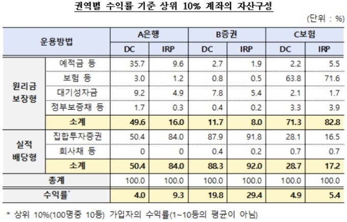 권역별 주요 회사의 수익률 상위 10% 가입자의 자산 구성을 보면 실적배당형 비중이 권역 평균치 대비 3배 이상 높은 것으로 나타났다.