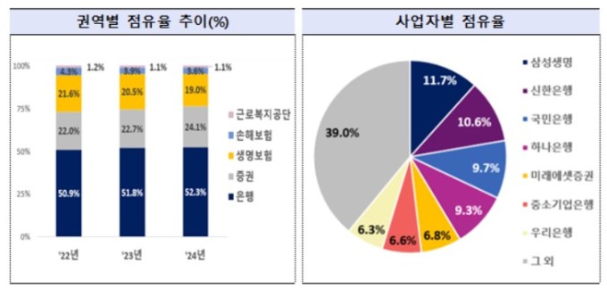 금융 권역별 적립금은 은행이 225조8000억원으로, 전년 대비 27조7000억원(14.0%) 증가했다. 증권은 103조900억원으로 17조2000억원(19.8%) 늘었다. 은행과 증권 점유율은 각각 0.5%포인트(p), 1.4%p 상승했다.