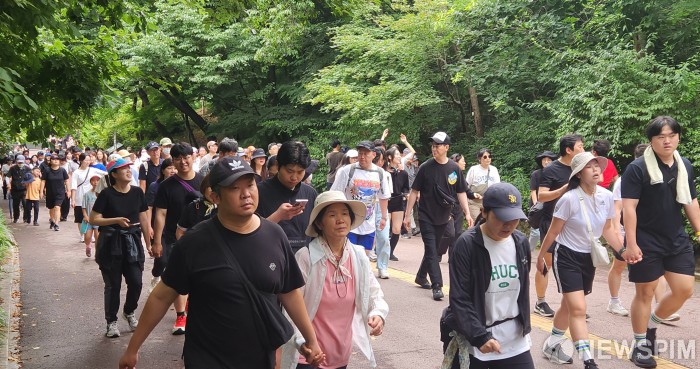 [서울=뉴스핌] 이길동 기자 = 14일 오전 서울 중구 남산국립극장 앞에서 열린 ‘손목닥터9988 200만 참여자 돌파 기념 남산 걷기&기부 챌린지’ 행사에서 참가자들이 남산 둘레길을 걷고 있다.2025.06.14 gdlee@newspim.com