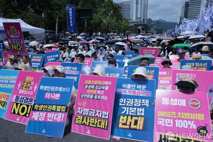 [서울=뉴스핌] 이길동 기자 =개신교계 단체인 거룩한방파제가 14일 오후 서울 중구 서울시의회 앞에서 퀴어문화축제 반대 집회를 열고 차별금지법 제정 반대 등을 외치고 있다.2025.06.14 gdlee@newspim.com