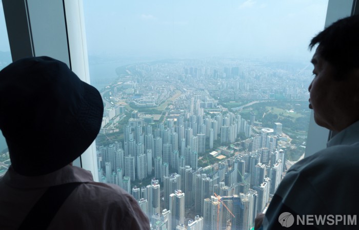 [서울=뉴스핌] 이길동 기자 = 서울 부동산 시장이 들썩이고 있다.18일 서울 송파구 롯데월드타워 서울스카이에서 시민들이 송파구 잠실 일대 아파트를 바라보고 있다,서울 주택매매 심리지수는 과열 구간에 근접했다. 국토연구원이 17일 발표한 '5월 부동산시장 소비심리지수'에 따르면 지난달 전국 주택매매시장 소비심리지수는 113.0으로 전월보다 4.3포인트(p) 올랐는데, 서울이 131.5로 가장 큰 상승 폭(11p)으로 반등을 주도했다. 2025.06.18 gdlee@newspim.com