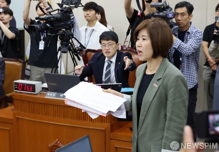 [서울=뉴스핌] 정일구 기자 = 김미애 국민의힘 의원이 18일 오전 서울 여의도 국회 보건복지위원회에서 열린 정은경 보건복지부 장관 후보자 인사청문회에서 정 후보자의 자료제출을 요구하며 항의하고 있다. 2025.07.18 mironj19@newspim.com