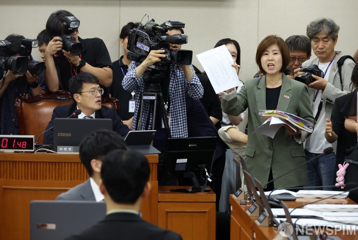 [서울=뉴스핌] 정일구 기자 = 김미애 국민의힘 의원이 18일 오전 서울 여의도 국회 보건복지위원회에서 열린 정은경 보건복지부 장관 후보자 인사청문회에서 정 후보자의 자료제출을 요구하며 항의하고 있다. 2025.07.18 mironj19@newspim.com