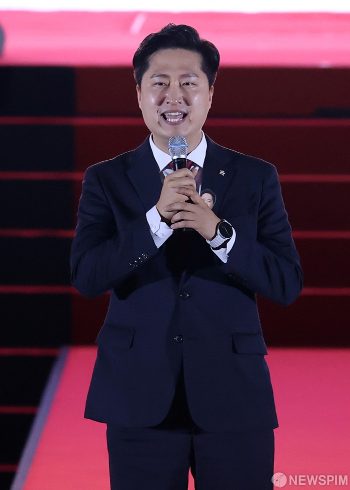 [청주=뉴스핌] 정일구 기자 = 우재준 국민의힘 청년 최고위원 후보가 22일 오후 충북 청주 오스코에서 열린 국민의힘 제6차 전당대회에서 비전발표를 하고 있다. 2025.08.22 mironj19@newspim.com