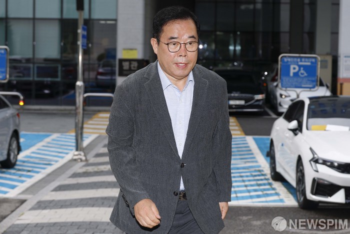 [서울=뉴스핌] 류기찬 기자 = 박성중 전 국민의힘 의원이 1일 오전 서울 양천구 서울남부지방법원에서 열린 '문재인 정권 선거법·공수처법 날치기 패스트트랙 저지' 1심 재판에 출석하고 있다. 2025.09.01 ryuchan0925@newspim.com