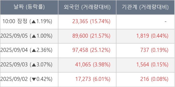 [서울=뉴스핌] 로보뉴스 = 08일 10시 15분 현재 한국비엔씨(256840)는 전일 대비 1.19% (현재가 5,100원) 상승했고, 외국인이 최근 5일 연속 순매수(누적 26.88만 주, 잠정) 행진을 하고 있다.