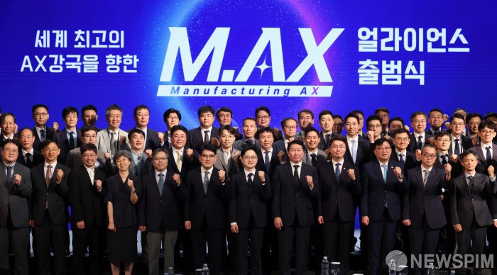 [서울=뉴스핌] 김학선 기자 = 김정관 산업통상자원부 장관, 최태원 대한상공회의소 회장을 비롯해 기업 대표들이 10일 서울 중구 웨스틴조선호텔에서 열린 제조AX 얼라이언스 출범식에서 기념촬영을 하고 있다. 2025.09.10 yooksa@newspim.com