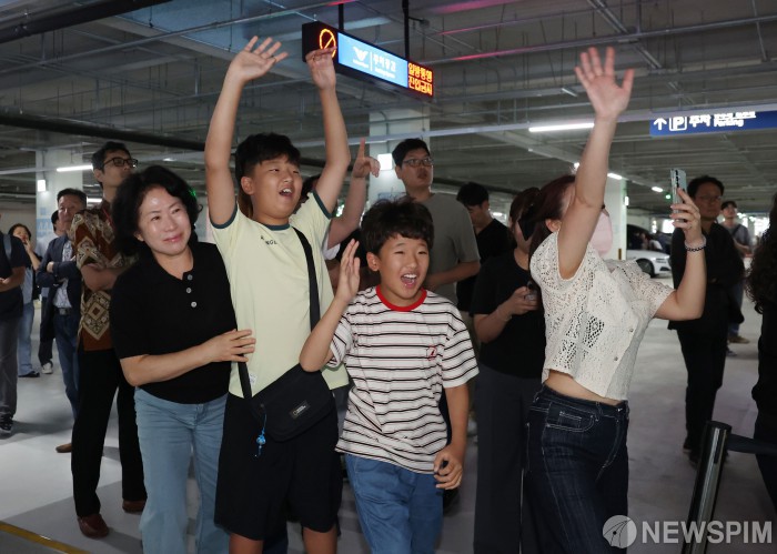 [영종도=뉴스핌] 김학선 기자 = 미국 이민당국에 의해 조지아주에 구금됐다가 석방된 한국인 근로자 아버지가 12일 오후 인천국제공항을 통해 귀국하자 가족들이 환호하고 있다. 2025.09.12 yooksa@newspim.com