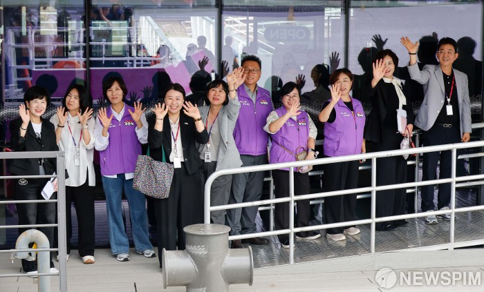 [서울=뉴스핌] 류기찬 기자 = 한강버스 정식 운항 첫날인 18일 오전 서울 마포구 한강버스 망원선착장에서 구 관계자들이 손을 흔들고 있다. 2025.09.18 ryuchan0925@newspim.com