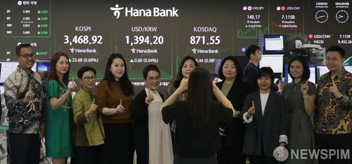 [서울=뉴스핌] 양윤모 기자 = 22일 오전 코스피가 전장 종가보다 23.68 포인트(0.69%) 상승하며 3468.92로, 코스닥은 8.44포인트(0.98%) 상승한 871.55로 장을 시작한 가운데, 서울 중구 하나은행 딜링룸에서 인도네시아 법이 직원들이 기념촬영을 하고 있다. 서울외환시장에서 원·달러 환율은 전장 대비 0.60원 상승한 1394.20원에 거래를 시작했다. 2025.09.22 yym58@newspim.com