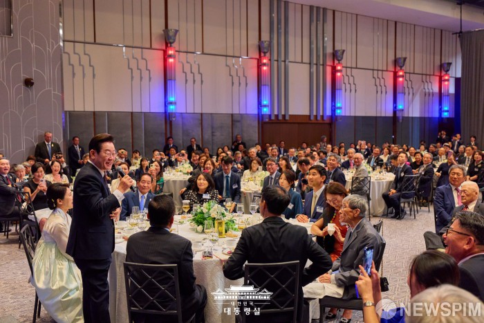 [서울=뉴스핌] 이재명 대통령이 지난 22일(현지시간) 미국 뉴욕의 한 호텔에서 열린 동포 간담회에서 발언을 하고 있다. [사진=대통령실] 2025.09.24 photo@newspim.com