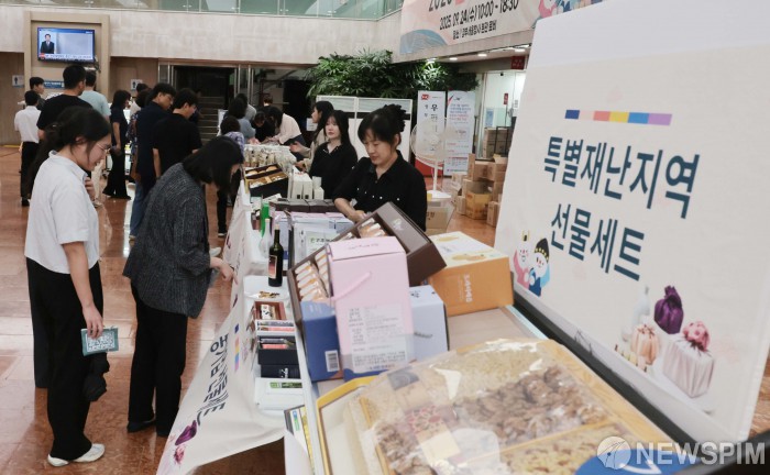 [서울=뉴스핌] 이길동 기자 = 24일 서울 종로구 정부서울청사에서 열린 2025 한가위 선물장터에서 청사 직원들이 선물 세트를 살펴보고 있다.2025.09.24 gdlee@newspim.com