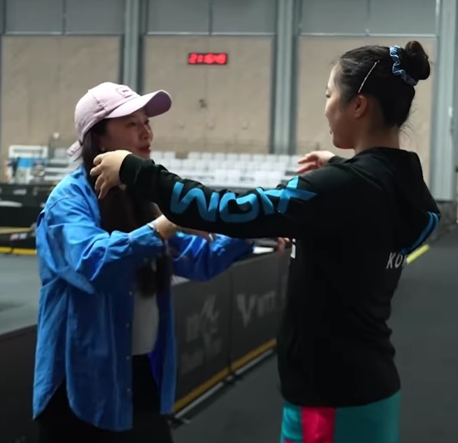 전지희가 지난달 29일 중국 스매시가 열린 베이징에서 만난 신유빈을 격려하고 있다. [사진=WTT 인스타그램] |