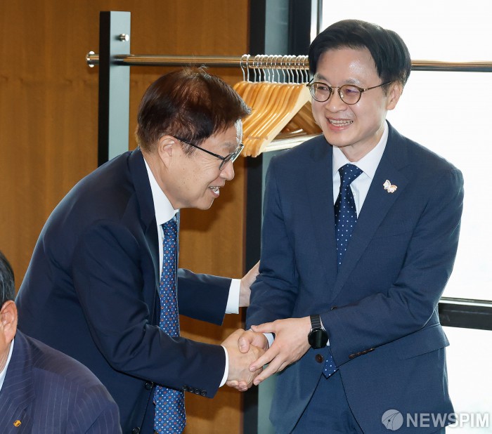 [서울=뉴스핌] 류기찬 기자 = 김정관 산업통상부 장관이 1일 오후 서울 중구 한국프레스센터에서 열린 '산업통상부 역대장관 초청 간담회'에서 참석자들과 인사를 나누고 있다. 2025.10.01 ryuchan0925@newspim.com