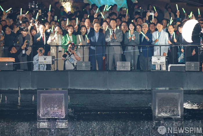 [서울=뉴스핌] 류기찬 기자 = 이명박 전 대통령, 오세훈 서울시장 등 참석자들이 1일 오후 서울 중구 청계광장에서 열린 ‘청계천 복원 20주년 행사’에서 레이저 아트를 관람하기 위해 대기하고 있다. 2025.10.01 ryuchan0925@newspim.com