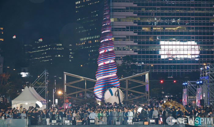 [서울=뉴스핌] 류기찬 기자 = 이명박 전 대통령, 오세훈 서울시장 등 참석자들이 1일 오후 서울 중구 청계광장에서 열린 ‘청계천 복원 20주년 행사’에서 레이저 아트를 관람하기 위해 대기하고 있다. 2025.10.01 ryuchan0925@newspim.com