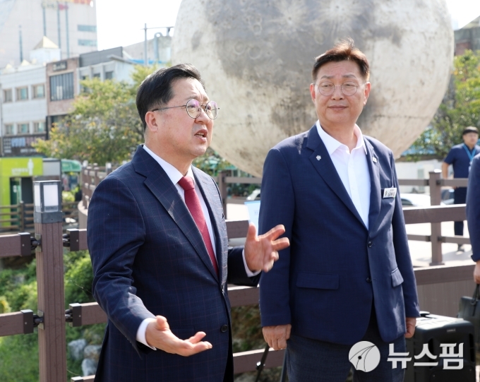 [대전=뉴스핌] 오종원 기자 = (왼쪽부터) 1일 오후 대전 중구 은행교에서 대전천을 둘러보고 있는 이장우 대전시장과 김제선 중구청장. 2025.10.01 jongwon3454@newspim.com |