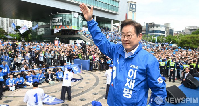 [광주=뉴스핌] 이형석 기자 = 이재명 더불어민주당 대선 후보가 17일 수많은 인파가 운집한 광주 서구 김대중컨벤션센터 광장에서 지지를 호소하고 있다. 2025.05.17 leehs@newspim.com |
