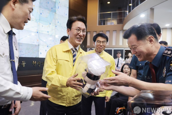[서울=뉴스핌] 이길동 기자 =김민석 국무총리가 2일 추석연휴를 앞두고 서울 종로구 서울경찰청 교통정보센터을 격려 방문해 교통상황 점검 후 근무자로 부터 경찰 마스코트를 선물 받고 있다.2025.10.02 gdlee@newspim.com