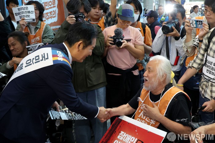 [서울=뉴스핌] 정일구 기자 = 정청래 더불어민주당 대표가 2일 오전 서울 용산구 용산역에서 박경석 전국장애인차별철폐연대(전장연) 상임공동대표와 인사하고 있다. 2025.10.02 mironj19@newspim.com